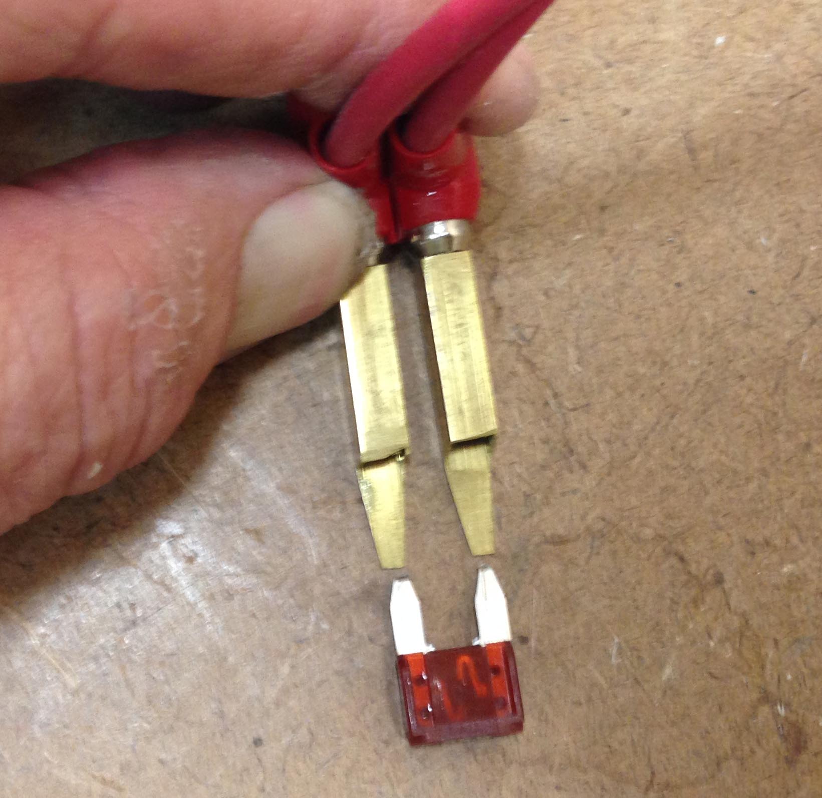 The 'blades' make a snug installation onto the bananna plugs. A visual check compares the spacing with an ATN fuse (A similar process can be sued to fabricate a probe for ATC fuse holders). |