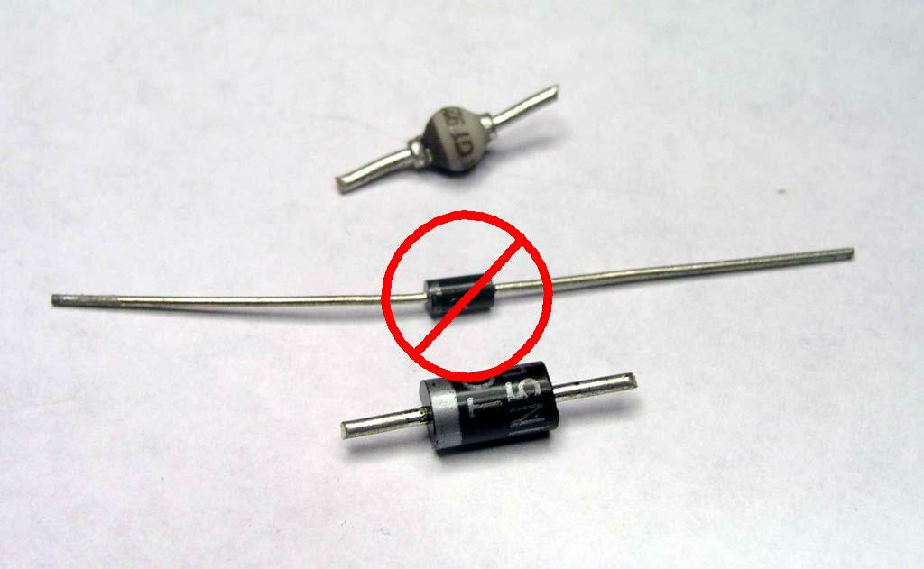 Method 1: Single Components . . .Should the parts list specify a diode as small as 1A, consider substituting a 3A device. The two sizes are illustrated here. Click here for larger image. The 3A devices (1N5400 series devices sold by Radio Shack and others) have larger, 20AWG leads, are mechanically more robust and easier to work with. The larger diode will perform quite nicely in place of the smaller 1A device. Further, ANY diode with a voltage rating of 50V or more is suited for use situations were in-bundle diodes are called for. Trim both leads to about 1/4" as shown here. |