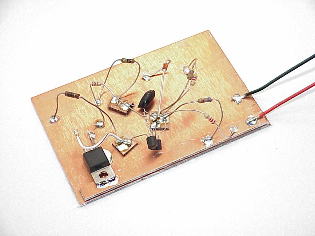 Click here for larger image. Here's what the circuit looked like after assembly. The 1/4" wide strips of copperclad are useful for "busses". For example, some circuits may have plus and minus power supplies that are tapped various places in the circuit. You can use super-glue to stick 1/4" wide strips of copper clad down the length of your "cladboard" so that the power supplies are readily available throughout the assembly. I use a large pair of diagonal cutters to cut 3/8" wide strips of copper clad into squares. A spot of supper-glue sticks the little sqaure down to the base. The upper surface of the square becomes a junction point where several wires can be brought together by tack-soldering the wire to the copper surface. Wires that go to "ground" simply solder down to the base layer of copper. |