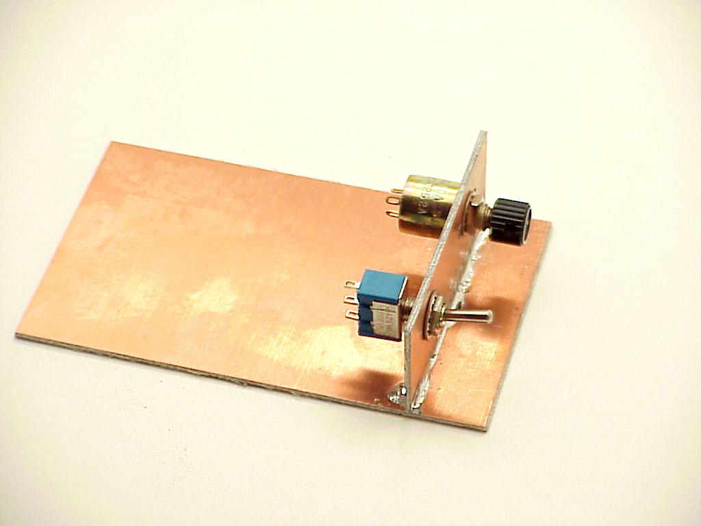 Click here for larger image. Does your circuit call for switches or other controls? You can easily add a "panel" to your experimental circuit with more copper-clad. Hold the panel on edge and run a bead of solder down each side to secure it to the base. Drill as needed to mount the controls. Here's an interesting note. The techniques described here can the the foundation for FINSHED goods in addition to being handy for circuit testing. On occasion I have provided a sturdy-quick-and-dirty article of electronics to a customer by starting with a baseplate of copper clad having mounting holes for screws. An enclosure for the product is built of copper-clad pieces soldered to the base. Sides of the enclosure will usually mount some form of connector . . . D-subminiatures are my favorites. Neatness doesn't count in cladboarding so the leads of my experimental circuit are generally not shortened. For a finished goods project, leads may be trimmed much shorter. But still, neatness doesn't account for much. When the circuit is performing as desired, I fill the cavity of the enclosure with expanding insulation foam available at hardware stores and lumber yards in aerosol cans. This stuff expands a LOT . . . put just the barest covering over the components. The level of foam will rise. Put in too much an you'll have a mess. Experiment with small cardboard or plastic enclosures to see how much liquid foam is needed to just fill the cavity. When the stuff cures, I carve it flush with the top of the enclosure and solder a lid made from copper clad over the whole thing. If you want to make it look really nice, you can paint the finished project. Once the project is foamed and closed, it is quite robust mechanically in spite of the chaotic construction techniques used inside. Some folks have suggested epoxy potting as a means immobilizing the parts. Epoxy is sturdy and a good insulator BUT . . . it is heavier. Further, in spite of its apparent viscosity, the damned stuff has ruined more than one connector or poorly sealed control . . . epoxy will leak into the tiniest holes!! Finally, epoxy gets a hard grip on everything and has a large coefficient of expansion. Temperature cycles of epoxy-potted assemblies have been known to fail due to repeated termo-mechanical stressing of components - most notably glass diodes. Foam is better. You don't have to fill it to the brim, just cover the parts to make sure they don't shake loose. Fly comfortably. 'lectric Bob . . . |