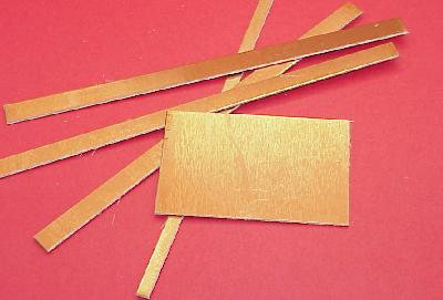 Alternative base materials have come along that are much handier than wood. My personal favorite is to use pieces of the raw material from which etched circuit boards are made. The material is called "copper clad" and is available in a variety of core material and cladding thicknesses. The most common copper clad begins with a 0.062" thick fiberglas and epoxy sheet to which a thin (0.0013") layer of copper is bonded . . . usually on both sides. You can buy prepackaged pieces of this material from hobby and professional electronics suppliers. Radio Shack stocks a few small sizes. Look for an etched circuit board manufacturer in your neck of the woods. Quite often their trash bins will yield useful scraps of the stuff. You can band saw or even cut with a hefty pair of shears. By far, the most useful tool for cutting this stuff is sheet metal shear. I keep a variety of cut sizes on hand for bases along with 1/4" and 3/8" wide strips as shown in this photograph. |