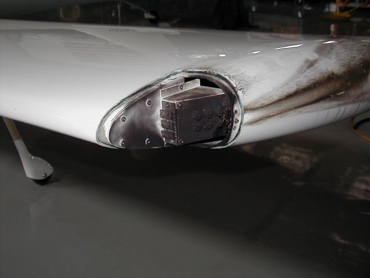 The next day I unpacked the aircraft and started to survey the damage. The first thing I looked for was welding of the control mechanisms and I couldn't see any evidence of this. I pulled off the tip lights and looked inside the wings and I could not see any internal damage, nor was any evident in the inspection ports. It appeared that the conduction path was only along the navigation lights wiring. Surprisingly the wires seemed intact.